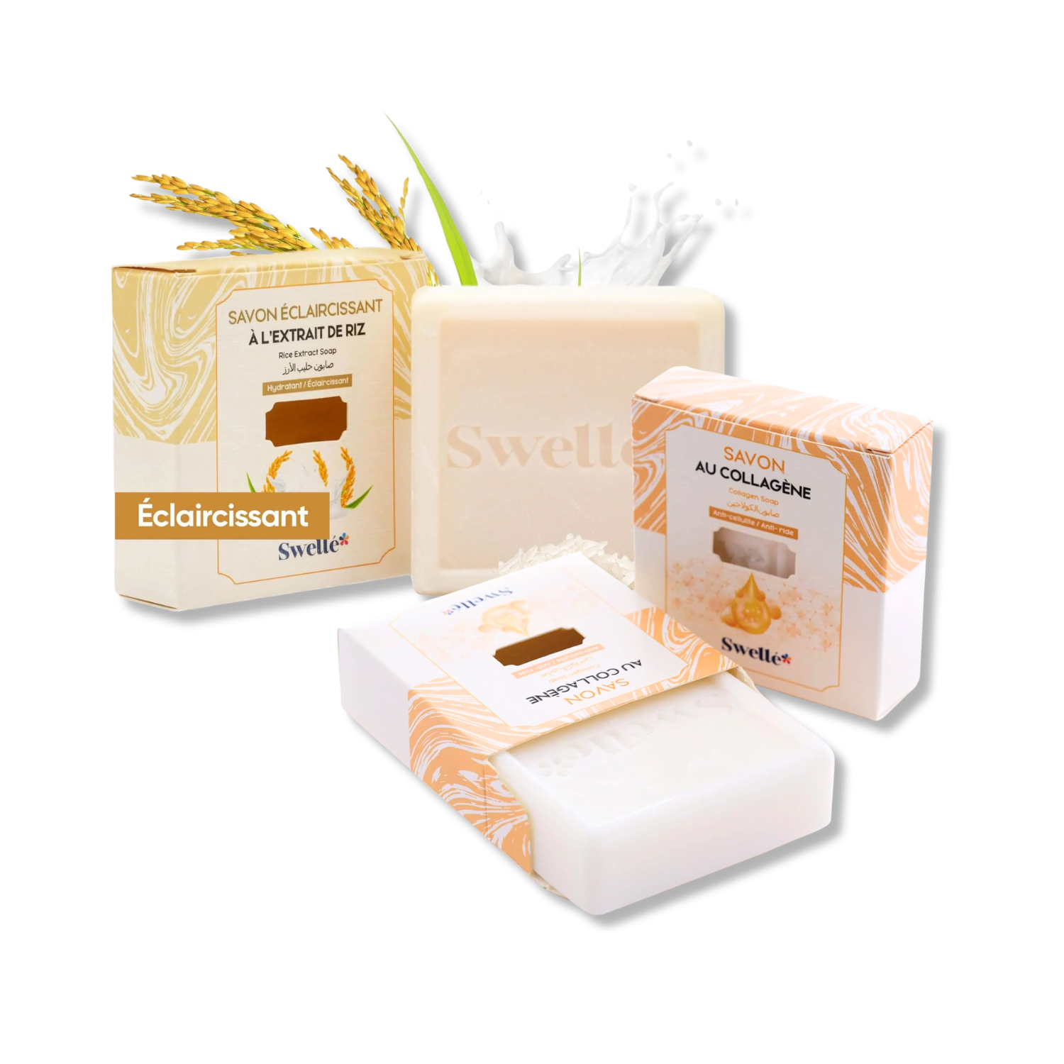 صابون سفیدکننده برنج SWELLE، مرطوب‌کننده و ضد لک‌های تیره + صابون مراقبت و زیبایی پوست SWELLE با کلاژن، طبیعی و مناسب پوست حساس | بسته دوتایی